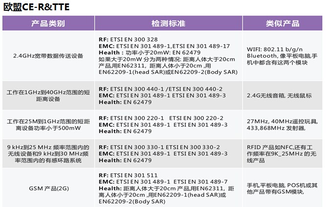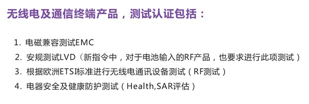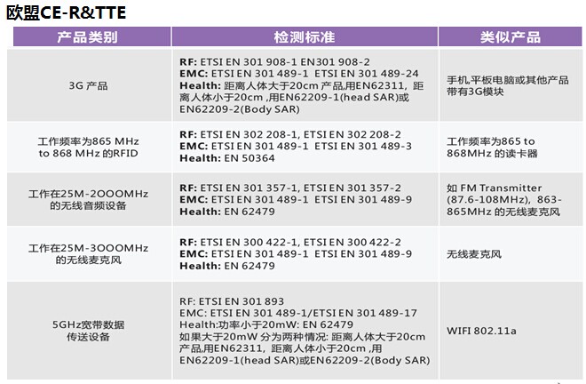 2014年5月22日,無線電設(shè)備指令(TheRadio Equipment Directive,RED)2014/53/EU正式在歐盟官方公報(bào)(OG)上公布,并于2014年6月12日生效。該指令將取代無線電與電信終端設(shè)備指令(R&TTE指令),2016年6月12日之前,成員國(guó)應(yīng)將該指令轉(zhuǎn)化為成員國(guó)法律,原R&TTE指令(1999/5/EC)也隨之作廢。2016年6月13日起,成員國(guó)應(yīng)采用新無線電設(shè)備指令(RED);2017年6月13日起,符合舊R&TTE指令的產(chǎn)品將不允許在歐盟市場(chǎng)上銷售。 On May 22, 2014, RED2014/53/EU Officially published in theEuropean Union's official gazette , and take effect on June 12, 2014. Thedirective will replace R&TTE directive, Before June 12, 2016, member statesshould convert the directive to member states law and the original R&TTEdirective (1999/5 / EC) is invalid. June 13, 2016, member states should adoptthe new RED; from June 13, 2017 products that meet the old R&TTE directivewill not be allowed in the eu market.