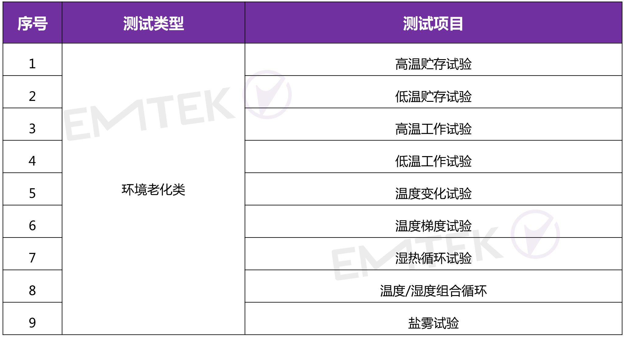 是將產(chǎn)品暴露在自然的或人工的環(huán)境條件下經(jīng)受其作用,以評(píng)價(jià)產(chǎn)品在實(shí)際使用、運(yùn)輸和貯存的環(huán)境條件下的性能,并分析研究環(huán)境因素的影響程度,包含的環(huán)境試驗(yàn)如高溫試驗(yàn)、低溫試驗(yàn)、溫濕度循環(huán)試驗(yàn)、冷熱沖擊試驗(yàn)、光老化試驗(yàn)、淋雨試驗(yàn)等;