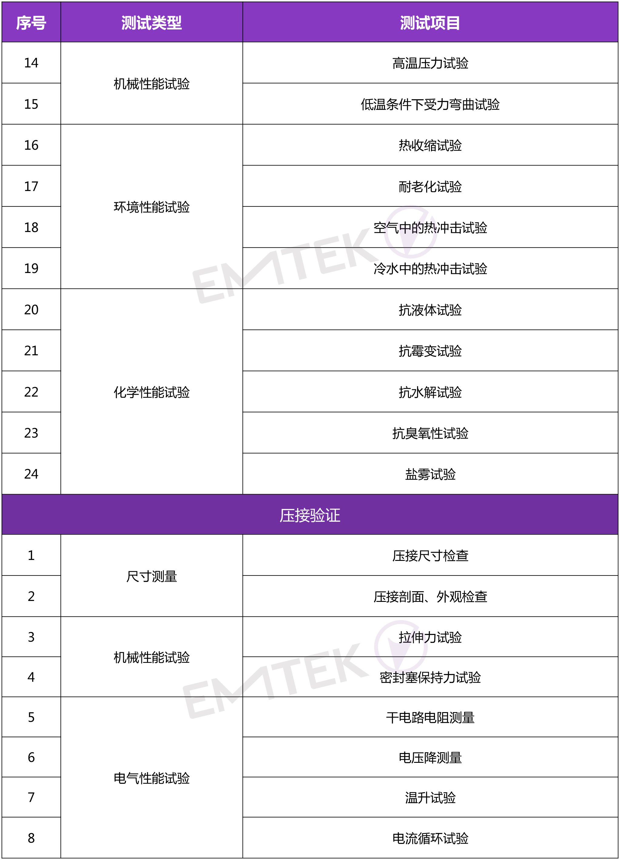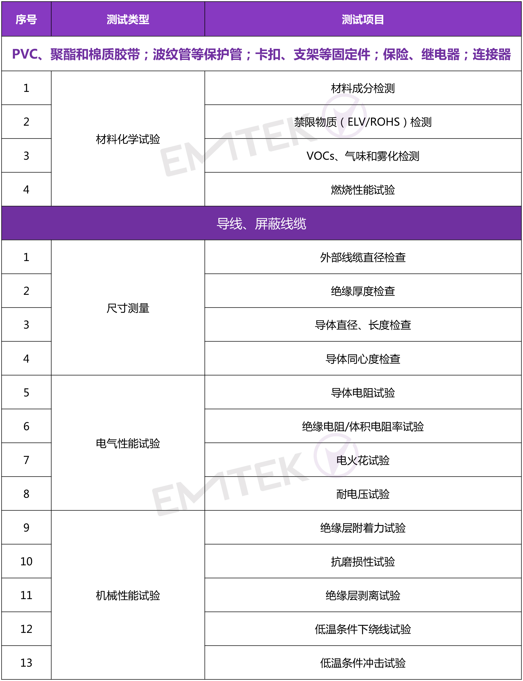 汽車線束環(huán)境空間多樣,經(jīng)歷復(fù)雜的濕熱變化和振動(dòng)變化。為確保線束功能可靠性,其材料選型和檢驗(yàn)、產(chǎn)品設(shè)計(jì)和驗(yàn)證、加工工藝設(shè)計(jì)和驗(yàn)證有嚴(yán)苛的標(biāo)準(zhǔn)規(guī)范和驗(yàn)證流程。典型的測(cè)試服務(wù)有ELV檢測(cè)、VOCs檢測(cè),以及機(jī)械性能、電氣性能、環(huán)境氣候性能等可靠性檢測(cè)。