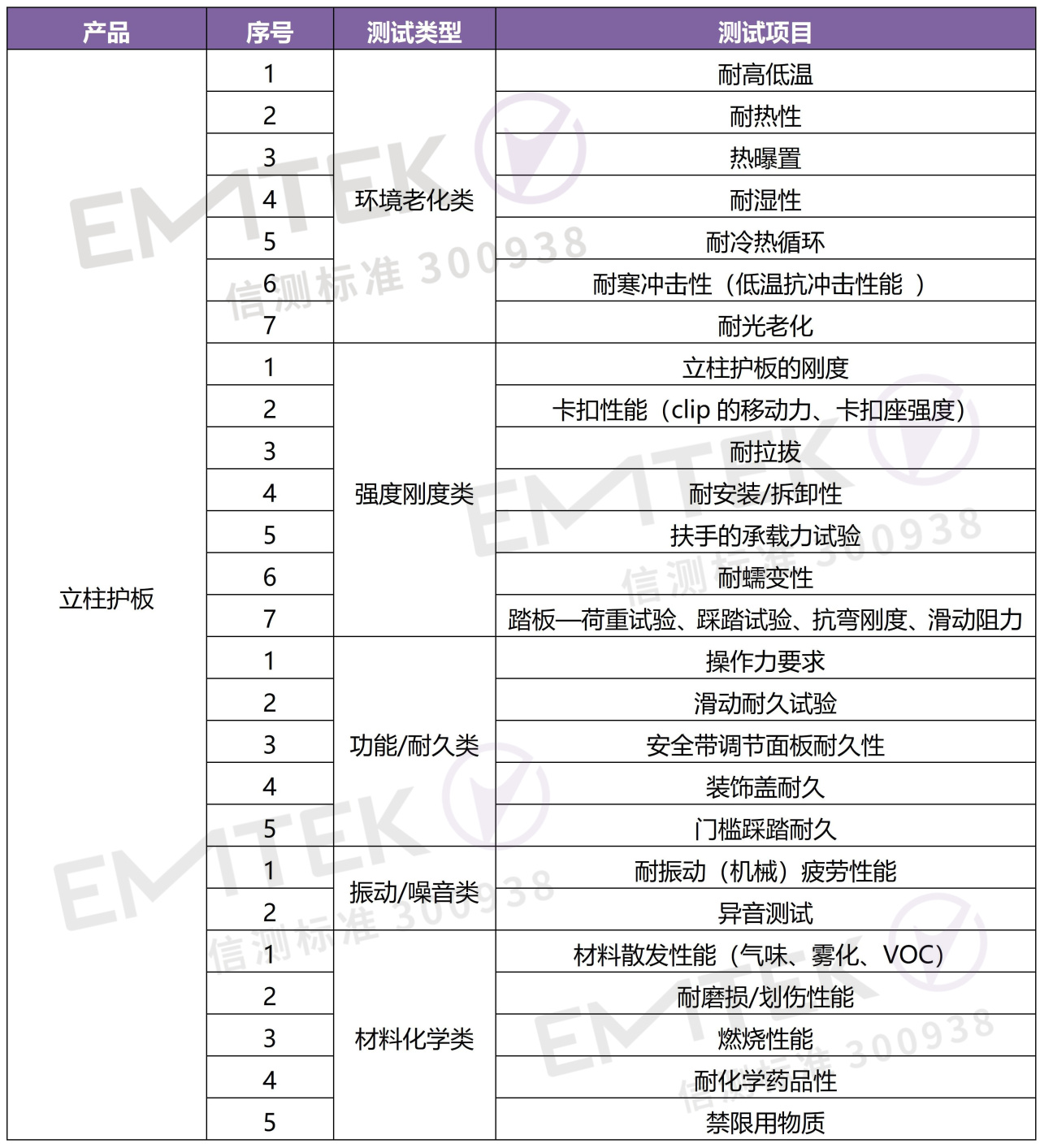 考核產(chǎn)品使用過程中承受的強(qiáng)度和剛性、操作功能特性及耐久、振動(dòng)試驗(yàn)等,比如立柱護(hù)板的剛度、卡扣性能、安裝/拆卸性能、安全帶調(diào)節(jié)面板操作性能、安全帶調(diào)節(jié)面板耐久性、裝飾蓋耐久、振動(dòng)耐久、振動(dòng)噪音等;