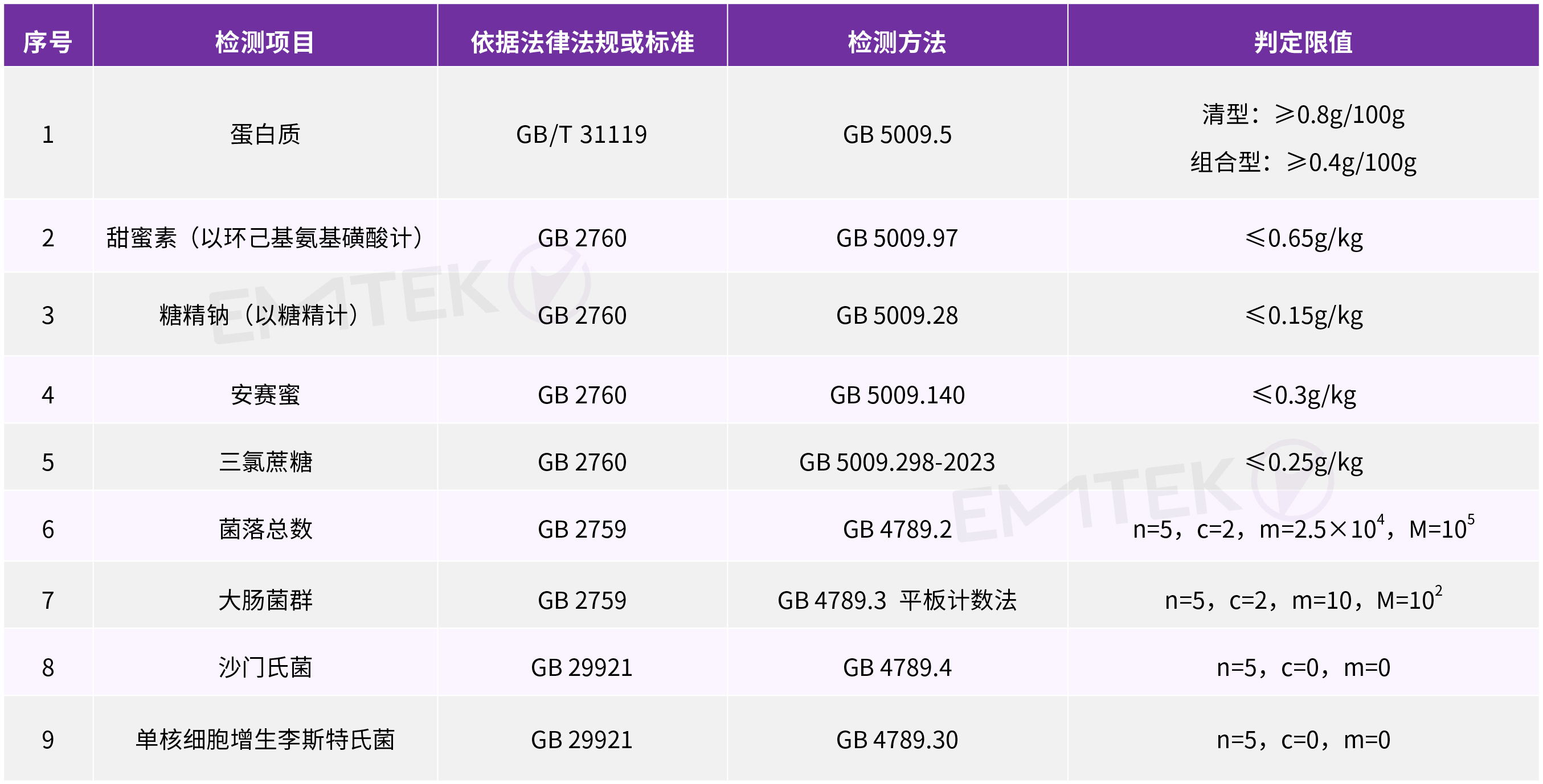 雪糕在《2024年全國食品安全監(jiān)督抽檢實施細則》中被劃分到冷凍飲品一類。參照的產品標準有GB/T 31119-2014《冷凍飲品 雪糕》和GB 2759-2015 《食品安全國家標準 冷凍飲品和制作料》,檢測項目和檢測限值見下表。