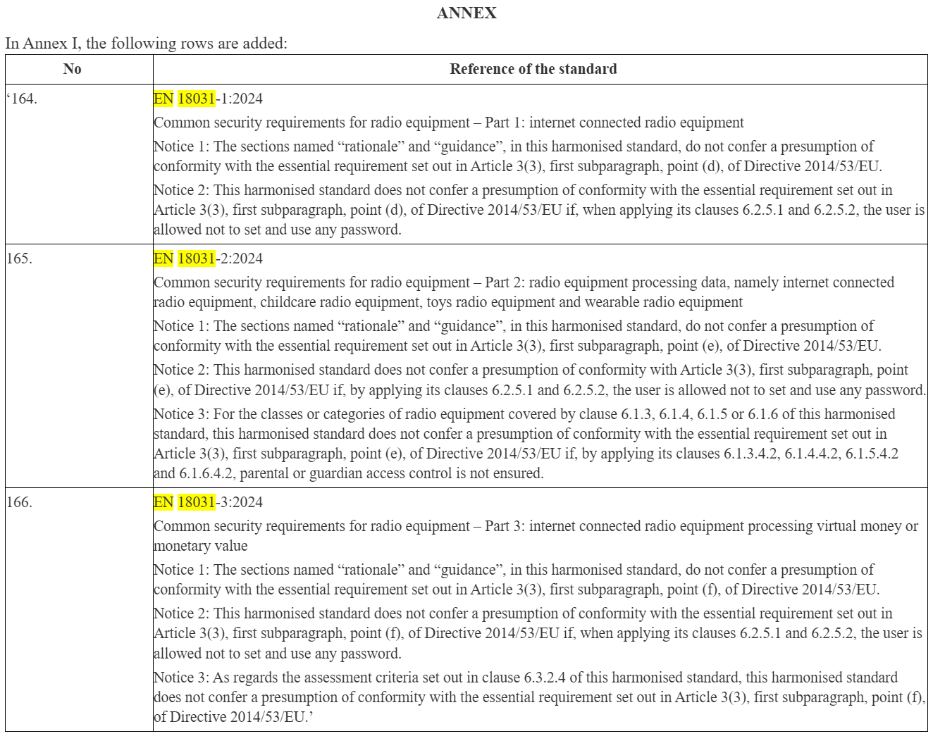 隨著2025年1月30日Implementing Decision (EU) 2025/138在歐盟官網(wǎng)的發(fā)布,EN 18031已正式被歐盟官方引用為RED-DA法規(guī)的統(tǒng)一協(xié)調(diào)標(biāo)準(zhǔn),這標(biāo)示歐盟在無線電產(chǎn)品領(lǐng)域的網(wǎng)絡(luò)安全合規(guī)邁出了重大的一步。雖然已被列入OJ,但官方也同時(shí)表示,EN18031的某些條款在RED-DA法規(guī)的符合性上仍具有限制性。