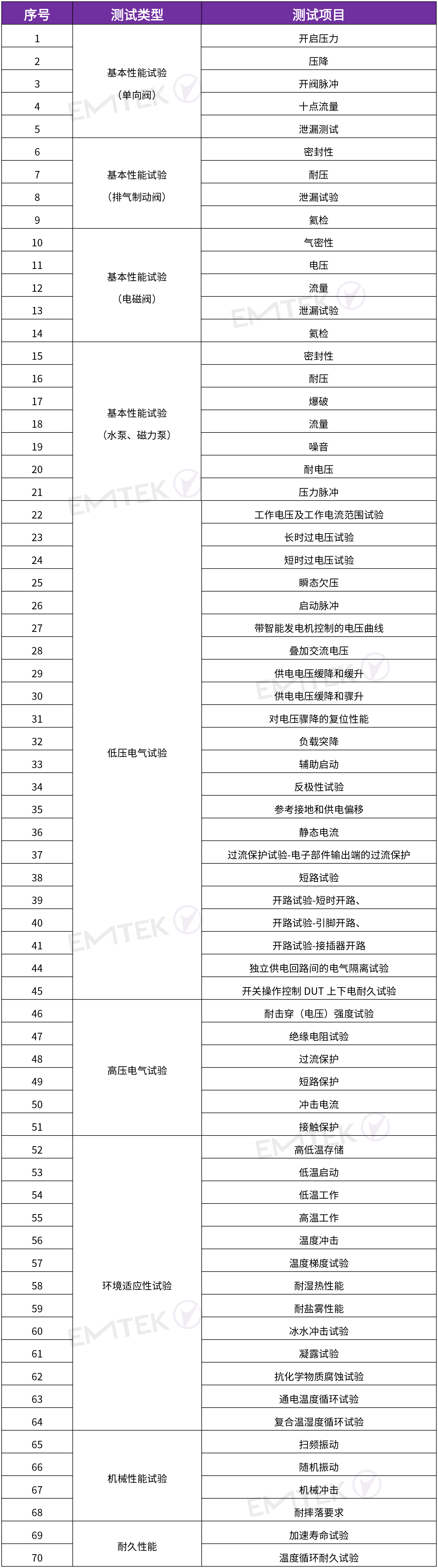 檢測(cè)并評(píng)價(jià)產(chǎn)品低壓電氣部分在經(jīng)受不同電氣負(fù)荷條件下的產(chǎn)品功能和性能表現(xiàn),包括工作電壓及工作電流范圍試驗(yàn)、長(zhǎng)時(shí)過(guò)電壓試驗(yàn)、短時(shí)過(guò)電壓試驗(yàn)、瞬態(tài)欠壓、啟動(dòng)脈沖、帶智能發(fā)電機(jī)控制的電壓曲線、疊加交流電壓、供電電壓緩降和緩升、供電電壓緩降和驟升、對(duì)電壓驟降的復(fù)位性能、負(fù)載突降、輔助啟動(dòng)、反極性試驗(yàn)、參考接地和供電偏移、靜態(tài)電流、過(guò)流保護(hù)、短路試驗(yàn)、開(kāi)路試驗(yàn)-短時(shí)開(kāi)路、開(kāi)路試驗(yàn)-引腳開(kāi)路、開(kāi)路試驗(yàn)-接插器開(kāi)路等。