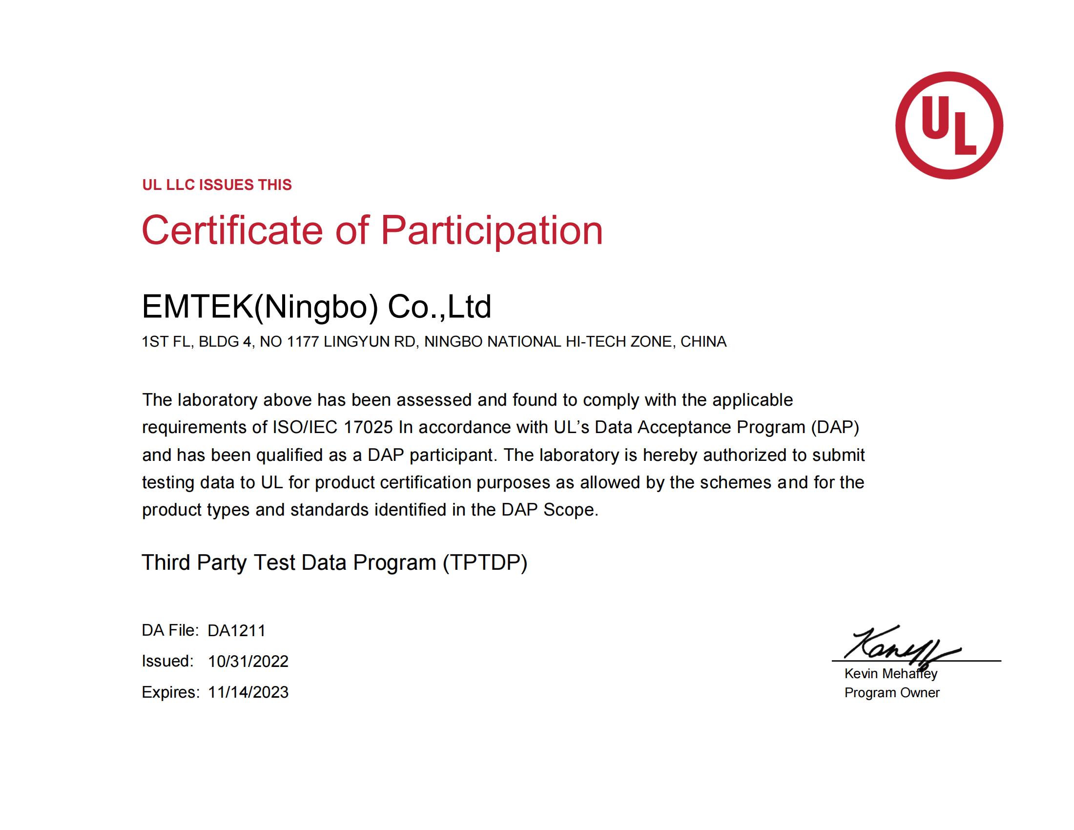近日,寧波市信測(cè)檢測(cè)技術(shù)有限公司順利通過UL-CAP復(fù)評(píng)審,收到美國UL公司簽發(fā)TPTDP資質(zhì)續(xù)期證書。