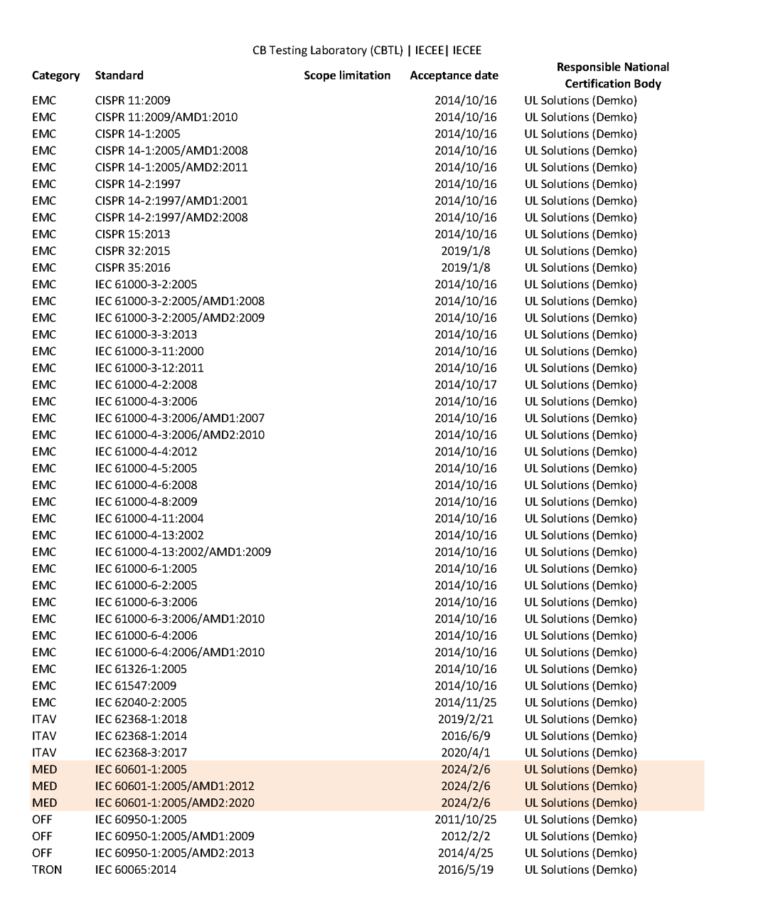 信測(cè)標(biāo)準(zhǔn)在CNAS認(rèn)可的基礎(chǔ)上于2022年9月20日取得ANSI AAMI ES 60601-1 / CAN CSA 60601-1的UL TPTDP認(rèn)可資質(zhì),2024年2月6日取得IEC 60601-1的CBTL認(rèn)可資質(zhì),可為廣大醫(yī)療電源廠商提供一站式檢測(cè)認(rèn)證服務(wù),助力認(rèn)證合格的醫(yī)療電源行銷全球。