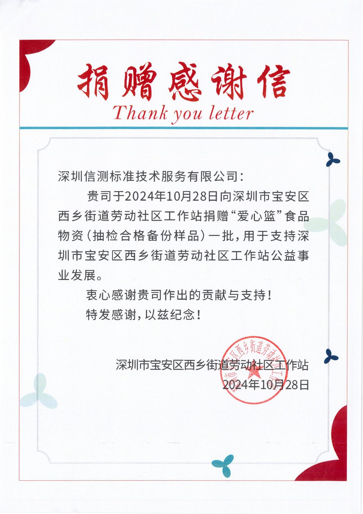 深圳市寶安區(qū)西鄉(xiāng)街道勞動(dòng)社區(qū)工作站為深表謝意,特向信測(cè)標(biāo)準(zhǔn)頒發(fā)了感謝信,以此作為對(duì)信測(cè)標(biāo)準(zhǔn)慷慨捐贈(zèng)的崇高敬意。