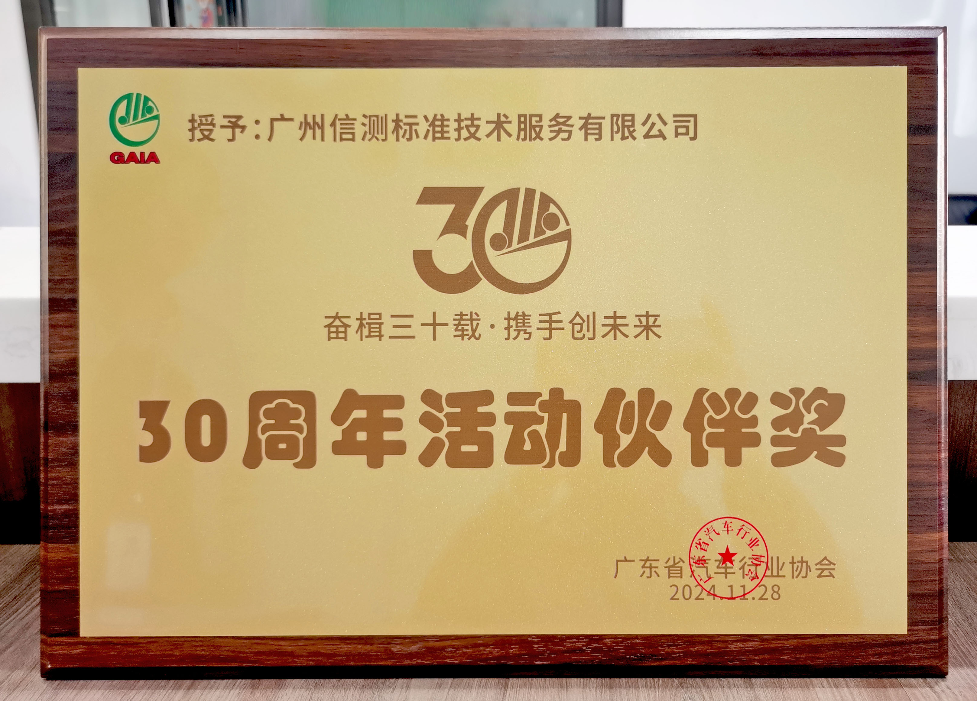 大會現(xiàn)場,信測標準獲頒30周年活動伙伴獎,并被授予了廣東省汽車行業(yè)協(xié)會第八屆理事會理事單位榮譽牌匾。這是對過去信測標準為廣東省汽車行業(yè)發(fā)展所做努力的認可和肯定,更是對未來信測標準助推汽車產(chǎn)業(yè)鏈及新能源產(chǎn)品檢驗檢測服務實現(xiàn)更高質(zhì)量發(fā)展的期許。