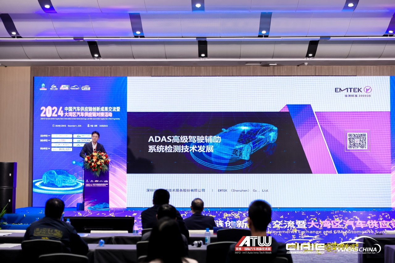 2024年12月4日,由中國汽車工業(yè)協(xié)會、廣東省汽車行業(yè)協(xié)會主辦,廣汽零部件有限公司、廣東省汽車工程學(xué)會、廣州汽車工業(yè)行業(yè)協(xié)會、廣州市智能網(wǎng)聯(lián)與新能源汽車產(chǎn)業(yè)人才聯(lián)合會等單位協(xié)辦,英佛會議展覽(上海)有限公司承辦的“2024中國汽車供應(yīng)鏈創(chuàng)新成果交流暨大灣區(qū)汽車供應(yīng)鏈對接活動”在深圳國際會展中心舉辦。信測標(biāo)準(zhǔn)總經(jīng)理袁奇先生出席活動并分享了主題為《ADAS高級駕駛輔助系統(tǒng)檢測技術(shù)發(fā)展》的演講。