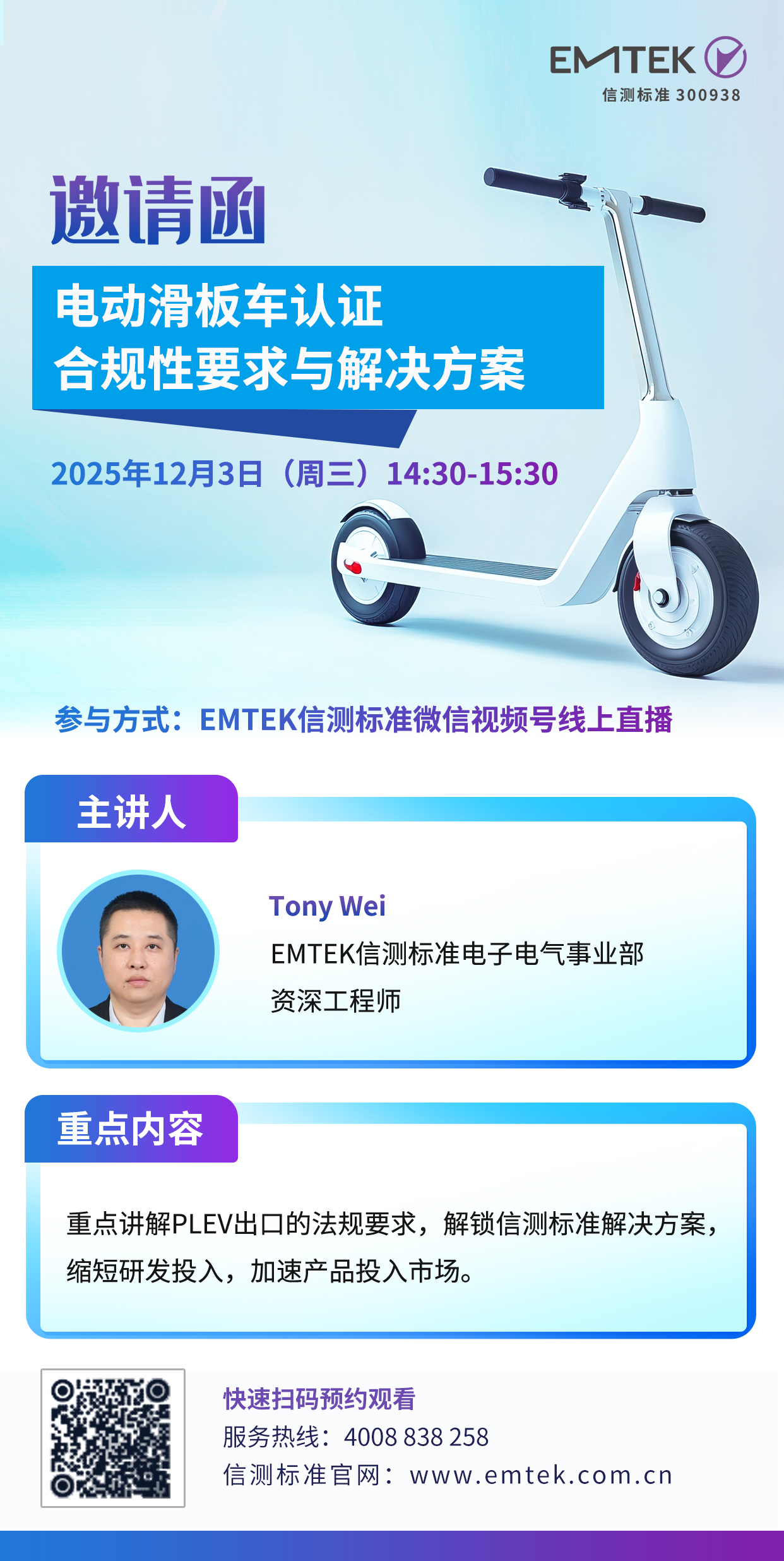 為幫助您撥開全球市場的合規(guī)迷霧,我們特此在12月3日(本周三)下午2點30分于信測標準微信視頻號舉辦 “電動滑板車認證合規(guī)性要求與解決方案”線上技術分享直播。本次會議將深度解析歐盟、美國、以色列、西班牙、澳洲、俄羅斯等多國熱門市場的核心認證要求,并分享高效通過認證的實戰(zhàn)策略與解決方案。