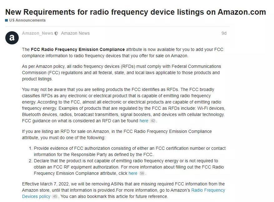 請(qǐng)注意!亞馬遜官方發(fā)布通知:2022年3月7日起,所有射頻設(shè)備(RFDs)必須提供FCC合規(guī)證明和信息,否則將會(huì)面臨被刪除處理。根據(jù)亞馬遜的政策,所有射頻設(shè)備(rfd)必須遵守聯(lián)邦通信委員會(huì)(FCC)的規(guī)定,以及適用于這些產(chǎn)品和產(chǎn)品清單的所有聯(lián)邦、州和地方法律。