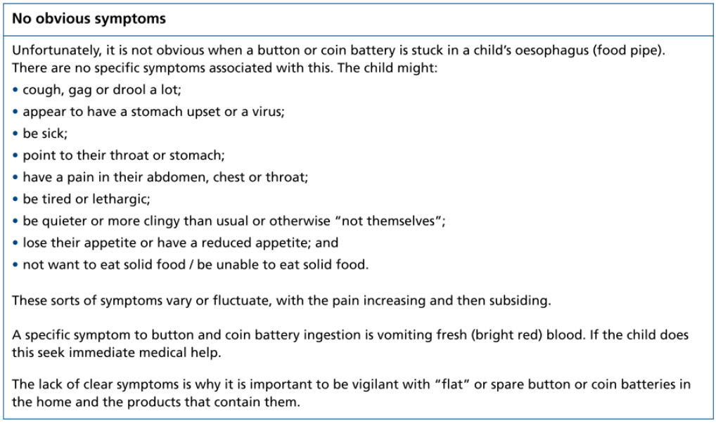?“If you think batteries might have been swallowed or placed inside any part of the body, seek immediate medical attention”.