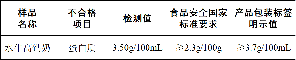 蛋白質(zhì)是由氨基酸以肽鍵連接在一起,并形成一定空間結構的高分子有機化合物。蛋白質(zhì)是構成機體組織、器官的重要成分,是構成機體多種重要生理活性物質(zhì)的成分,還能供給能量?!妒称钒踩珖覙藴?調(diào)制乳》(GB 25191—2010)中規(guī)定,調(diào)制乳的蛋白質(zhì)含量應≥2.3 g/100g,且該產(chǎn)品外包裝標簽明示“優(yōu)質(zhì)乳蛋白≥3.7g/100mL”,檢測結果單位換算后,受檢本批次產(chǎn)品中蛋白質(zhì)的檢測值符合食品安全國家標準規(guī)定,但不符合產(chǎn)品明示質(zhì)量要求。