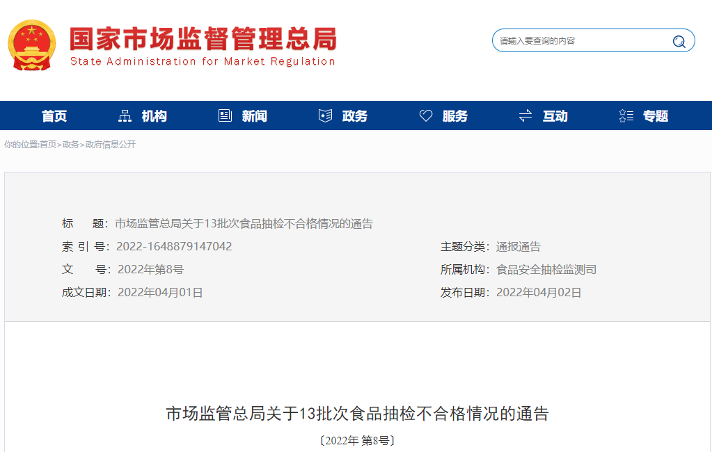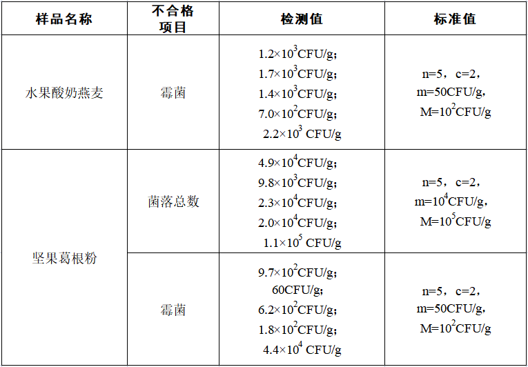 近期,國家市場監(jiān)管總局組織食品安全監(jiān)督抽檢,抽取糧食加工品、食用農(nóng)產(chǎn)品、食糖、茶葉及相關制品、乳制品、飲料、酒類、糕點、炒貨食品及堅果制品、餅干、淀粉及淀粉制品、方便食品、薯類和膨化食品、蛋制品、豆制品、蜂產(chǎn)品、蔬菜制品、水果制品、肉制品、水產(chǎn)制品、調(diào)味品、冷凍飲品、速凍食品、糖果制品、嬰幼兒配方食品、特殊膳食食品和食用油、油脂及其制品等27大類食品650批次樣品,檢出其中糧食加工品、乳制品、糕點、方便食品、薯類和膨化食品、水果制品和嬰幼兒配方食品等7大類食品13批次樣品不合格。