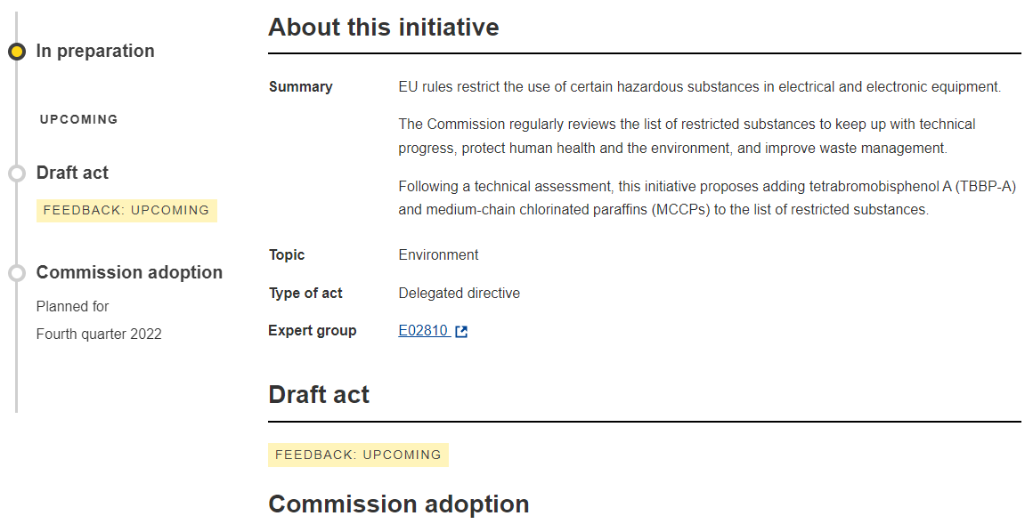 近日,歐盟委員會(huì)(European Commission)在其立法公眾咨詢平臺(tái)“有你說”發(fā)布了一項(xiàng)關(guān)于限制在電氣電子設(shè)備中使用某些有害物質(zhì)的立法動(dòng)議(Initiative)。歐盟委員會(huì)經(jīng)過技術(shù)評估,動(dòng)議將四溴雙酚A(TBBP-A) 和中鏈氯化石蠟 (MCCP) 添加到RoHS指令的限制物質(zhì)清單中。如果該動(dòng)議順利被采納, 包括之前已經(jīng)存在的10種受限物質(zhì),RoHS指令的附件II里的受限物質(zhì)將增加至12種。