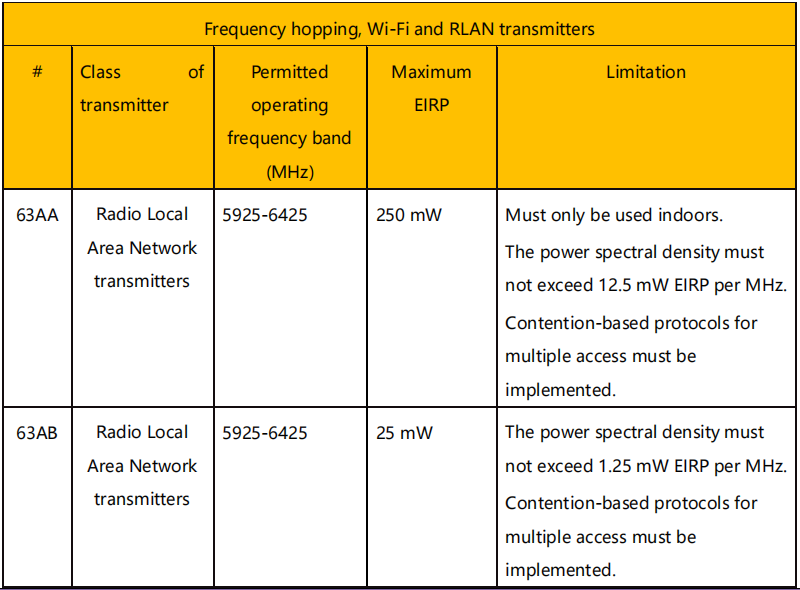 目前的文件增加了一個(gè)新的頻段:5925-6425MHz,用于無(wú)線電局域網(wǎng)發(fā)射器的低功率水平下的運(yùn)行,并糾正了以前在載波頻率方面的錯(cuò)誤。