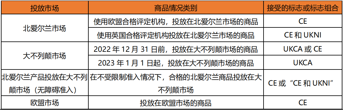 受 UKCA 認(rèn)證法規(guī)影響的產(chǎn)品包括但不限于個(gè)人防護(hù)裝備(PPE),如頭盔、太陽(yáng)眼鏡,玩具,電子電氣設(shè)備(EEE)等。歐盟、大不列顛、北愛(ài)爾蘭市場(chǎng)各市場(chǎng)在不同階段可以接受的標(biāo)志如下: