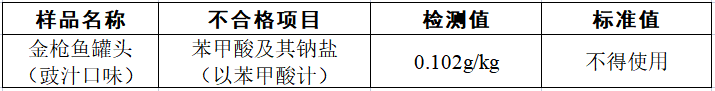 《食品安全國家標準 食品添加劑使用標準》(GB 2760—2014)中規(guī)定,苯甲酸及其鈉鹽(以苯甲酸計)在水產(chǎn)動物類罐頭中不得使用;《食品安全國家標準 食品添加劑使用標準》(GB 2760—2014)中規(guī)定,苯甲酸及其鈉鹽(以苯甲酸計)在醬鹵肉制品中不得使用。