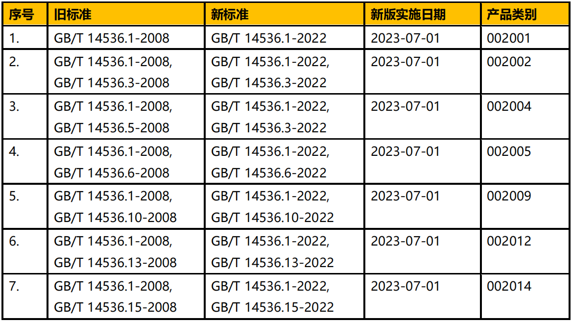 GB/T 14536.1-2022《電自動控制器 第 1 部分:通用要求》等標(biāo)準(zhǔn)(以下簡稱“新標(biāo)準(zhǔn)”)已發(fā)布,并將于 2023 年 7 月 1 日實施(見表 1)。中國質(zhì)量認(rèn)證中心(簡稱 CQC)對涉及表 1 中標(biāo)準(zhǔn)的 CQC13-448321-2016《家用和類似用途電自動控制器安全認(rèn)證規(guī)則》進(jìn)行了修訂。現(xiàn)將規(guī)則修訂及實施新版標(biāo)準(zhǔn)有關(guān)要求通知如下: