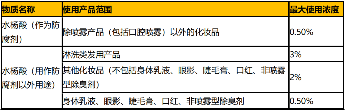 2023 年 6 月 9 日,歐盟消費者安全科學(xué)委員會(SCCS)發(fā)布 SCCS/1646/23 號文件,即化妝品中水楊酸使用要求的最終意見,具體內(nèi)容見下表。該意見已通過 SCCS 審查,將于歐盟官方公報正式發(fā)布后生效。