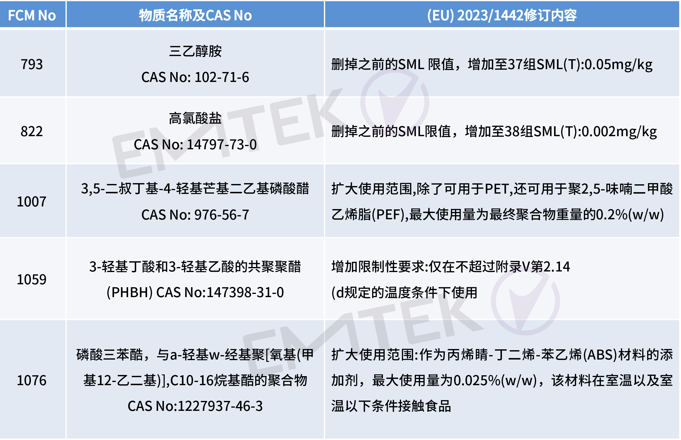 2023年7月12日,歐盟官方公報(bào)發(fā)布塑料食品接觸材料法規(guī)(EU) No 10/2011的最新修訂法規(guī) (EU) 2023/1442。新法規(guī)將于2023年8月1日生效,新法規(guī)針對(duì)附件I中部分授權(quán)物質(zhì)進(jìn)行刪減,修訂及新增。