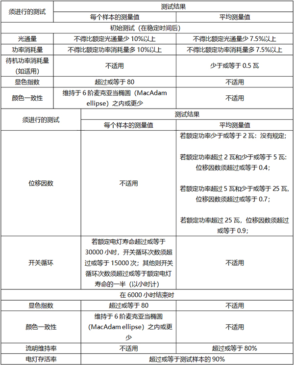 15.6.1、在依據(jù)條例第6 條向署長(zhǎng)呈交的測(cè)試報(bào)告中,根據(jù)CIE 84、IEC 62612、IEC 62301 或署長(zhǎng)批準(zhǔn)的其他同等國(guó)際標(biāo)準(zhǔn)進(jìn)行測(cè)試的結(jié)果必須顯示有關(guān)型號(hào)的發(fā)光二極管燈符合以下表現(xiàn)規(guī)定——