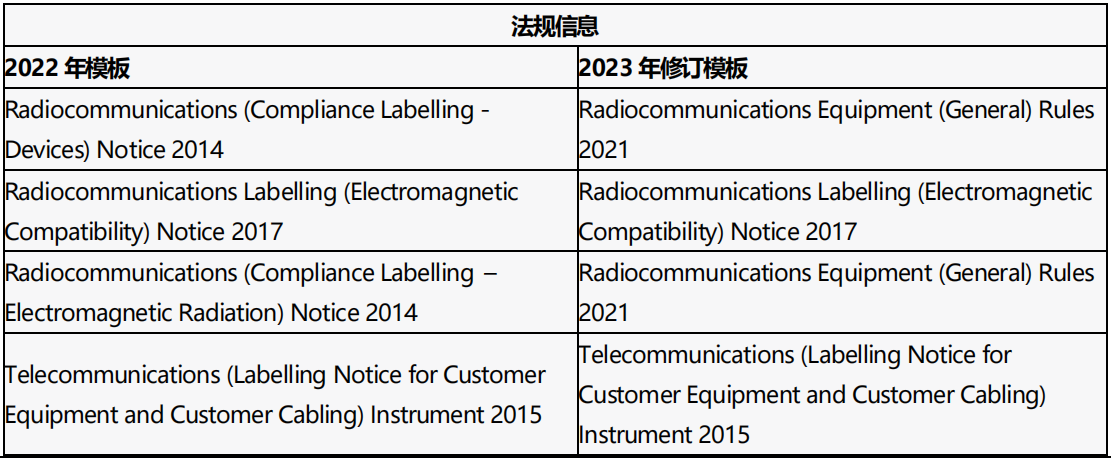 2023 年7 月消息,澳大利亞通信和媒體管理局(ACMA)修訂了供應(yīng)商合規(guī)聲明(SDoC)模板,此次更新有一些措辭更新,但重點(diǎn)變更集中在法規(guī)信息方面,請(qǐng)參考重點(diǎn)如下表。