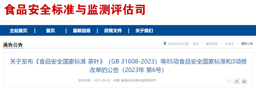 關于發(fā)布《食品安全國家標準 茶葉》(GB 31608-2023)等85項食品安全國家標準和3項修改單的公告(2023年 第6號)