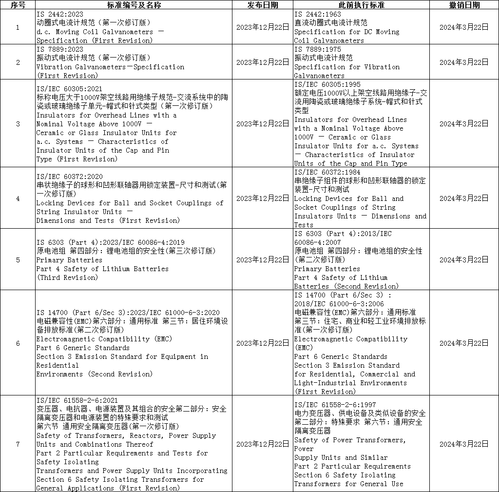 2023 年 12 月 27 日,印度標(biāo)準(zhǔn)局修訂并發(fā)布電流計(jì)、鋰電池、變壓器等 7 項(xiàng)標(biāo)準(zhǔn),修訂后標(biāo)準(zhǔn)自發(fā)布之日起正式生效,此前執(zhí)行標(biāo)準(zhǔn)將于 2024 年 3 月 22 日撤銷,具體修訂情況如下。