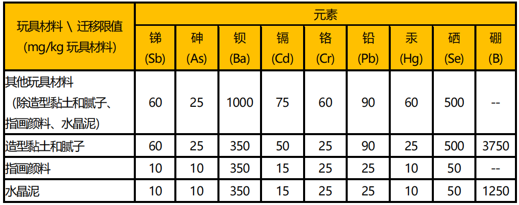 (2) 降低4 種元素 (Ba, Cd, Cr, Hg)的遷移限值至與造型黏土一致。