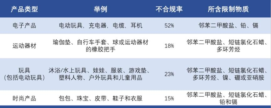2023 年 12 月,歐洲化學(xué)品管理局(ECHA)論壇公布了第 10 次聯(lián)合執(zhí)法項(xiàng)目(REF-10)的調(diào)查結(jié)果。結(jié)果顯示,市場(chǎng)上某些消費(fèi)品中含有過量的危險(xiǎn)化學(xué)品,如鉛和鄰苯二甲酸鹽,總不合規(guī)率達(dá)到了 18%。