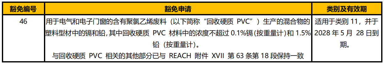 此外,該豁免的范圍與 REACH 附件 XVII 第 63 條中有關 PVC2 中鉛的規(guī)定對回收 PVC 中鉛的減損一致。因此,EC 已授予 RoHS 指令附件 I 第 11 類的豁免。表 A 豁免詳情。