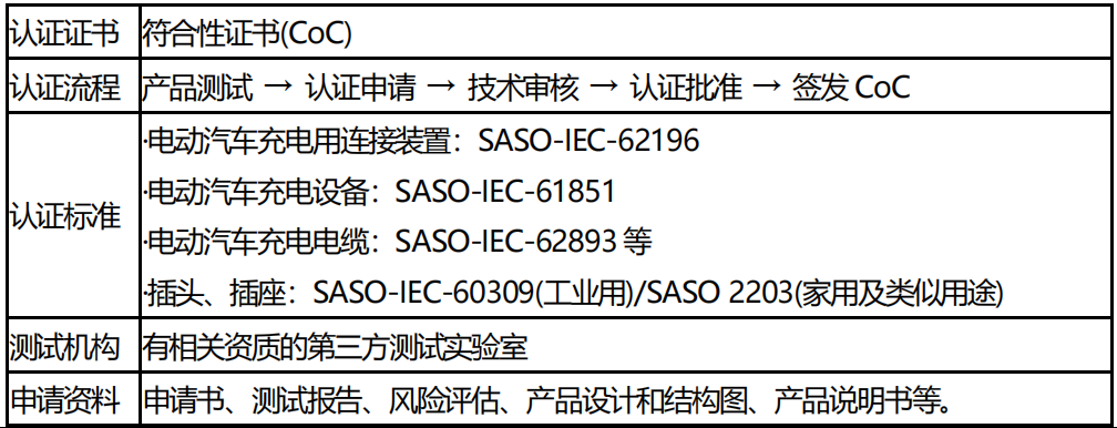 沙特阿拉伯為實(shí)現(xiàn)本國“2030 愿景”,減少碳排放,大力鼓勵(lì)電動(dòng)汽車產(chǎn)業(yè)的發(fā)展并支持投資電動(dòng)汽車基礎(chǔ)設(shè)施建設(shè),逐漸成為電動(dòng)汽車及充電設(shè)備企業(yè)出口新興潛力市場。2019 年以來,沙特相繼發(fā)布了電動(dòng)汽車相關(guān)的技術(shù)法規(guī)以及電動(dòng)汽車充電設(shè)備認(rèn)證要求,以下為電動(dòng)汽車充電設(shè)備出口沙特阿拉伯的強(qiáng)制性認(rèn)證要求。