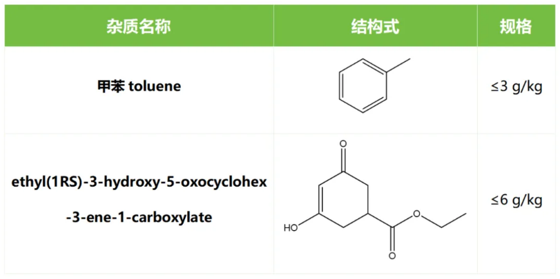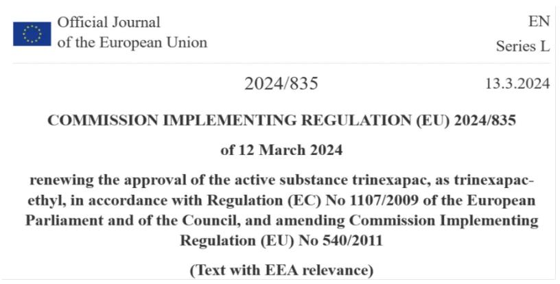 2024 年 3 月中旬,歐盟委員會(EC)發(fā)布正式決議,基于歐盟農藥法規(guī)(REGULATION (EC) No 1107/2009),批準活性物質抗倒酯(trinexapac-ethyl)的有效期延長至 2039 年 4 月 30 日。至此抗倒酯完成此輪再評審,再評審后抗倒酯的活性物質規(guī)格由 940 g/kg 提升至 950 g/kg,并新增以下兩個相關雜質: