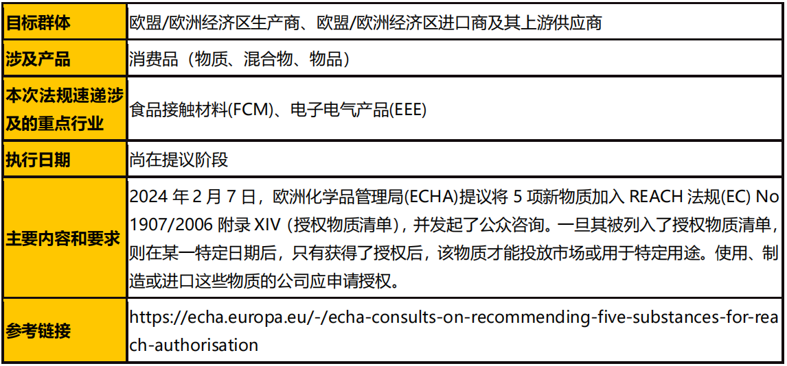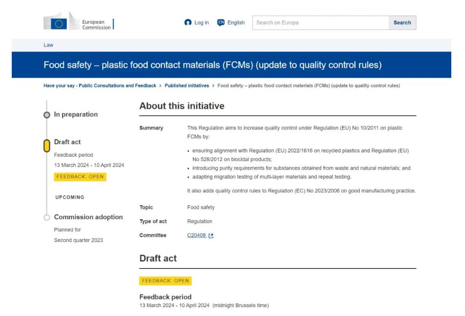 2024 年 3 月,歐盟委員會公布塑料食品接觸材料法規(guī) Regulation (EU) No. 10/2011 的更新草案,并開啟公眾意見征求。這將是該法規(guī)自發(fā)布以來的第 18 次更新。