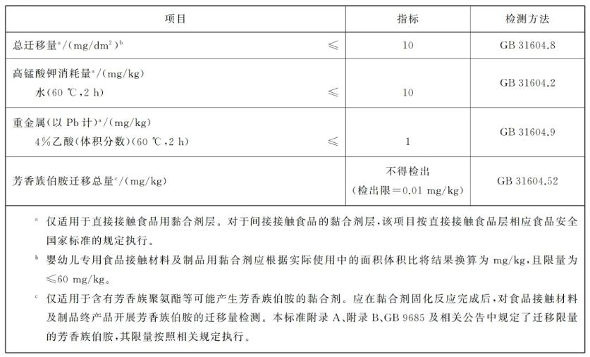 1) 對于總遷移量、高錳酸鉀消耗量以及重金屬的限量要求僅適用于直接接觸食品用黏合劑層;
