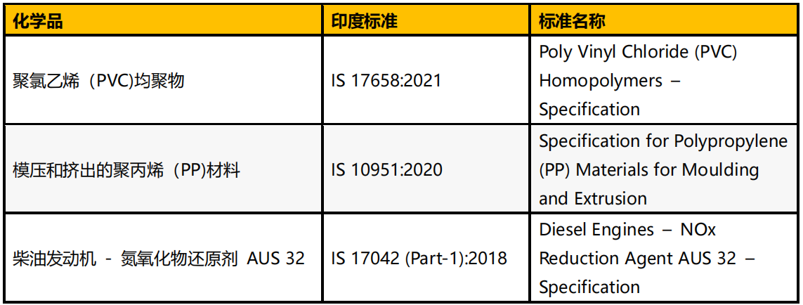 這 3 類化學品的 QCOs 將于 2024 年 8 月 25 日起強制執(zhí)行。以下是 3 類化學品需具體執(zhí)行的印度標準: