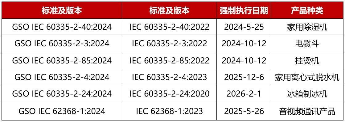 繼GSO 于2023 年 3 月26 日發(fā)布的有關推遲實施 IEC 60335-2-24:2020(第8 版)標準的公告,GSO 于2024 年3 月簽發(fā)了關于該標準采用的重要更新和澄清。GSO 已正式采用該標準為GSO IEC 60335-2-24:2024, 從2024年1月31 起生效。