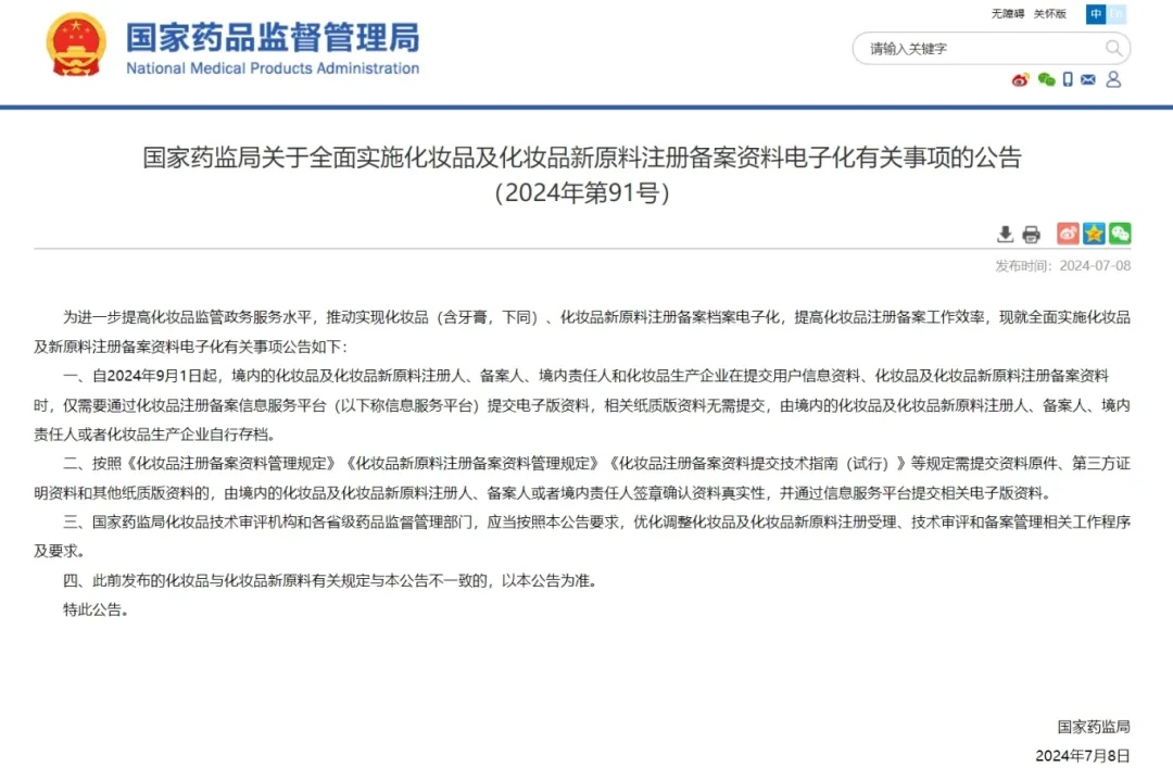 2024年7月8日,為進一步提高化妝品監(jiān)管政務服務水平,國家藥監(jiān)局發(fā)布《關(guān)于全面實施化妝品及化妝品新原料注冊備案資料電子化有關(guān)事項的公告》(2024年第91號)。