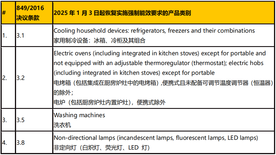 根據(jù)白俄羅斯部長(zhǎng)理事會(huì) 2024 年 9 月 26 日第 708 號(hào)決議,白俄羅斯針對(duì) 2016 年 10 月 21 日發(fā)布的第849 號(hào)決議中列出的部分(四類)使用能源的電器產(chǎn)品將恢復(fù)實(shí)施強(qiáng)制性能源效率/能效標(biāo)簽要求,強(qiáng)制實(shí)施日期為 2025 年 1 月 3 日。