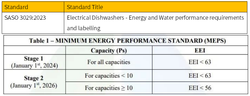 2025年9月,沙特阿拉伯標準組織SASO(Saudi Standards, Metrology and Quality Organization)發(fā)出通知提醒,電動洗碗機產(chǎn)品的最新能效標準SASO 3029:2023將于2026年1月1日起實施第二階段要求。