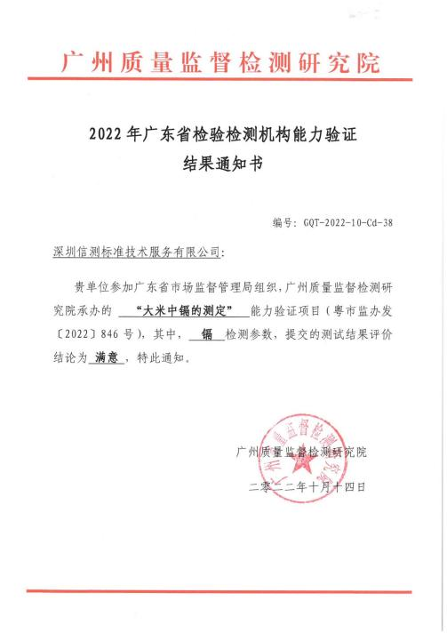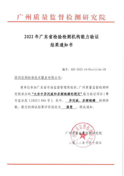 近日,在由廣東省市場監(jiān)督管理局組織、廣州質量監(jiān)督檢測研究院承辦的“2022廣東省檢驗檢測機構能力驗證”中,信測標準參加的“大米中鎘、異丙威和殺螟硫磷的測定”食品檢測領域3個能力驗證項目,均獲得“滿意”!